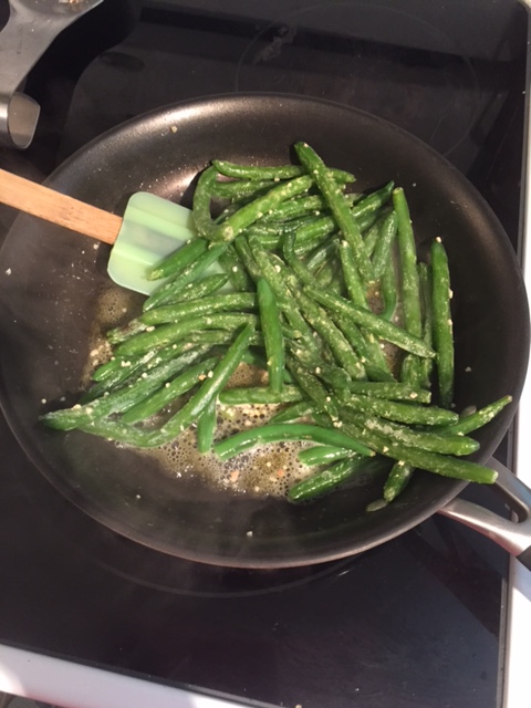Toss in your green beans and give them a good coat in that buttery goodness! Let them cook for a couple of minutes so they can begin to soak up some of the butter-garlic flavor.