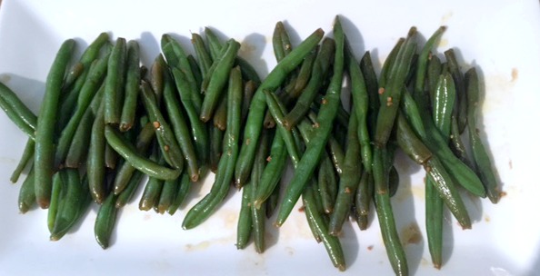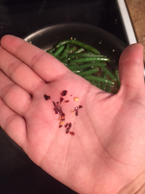 After your green beans have had a nice butter bath, add the soy sauce and crushed red pepper flakes. Remember a little goes a long way when it comes to the flakes. Here’s about how much I add just for a little bit of kick.